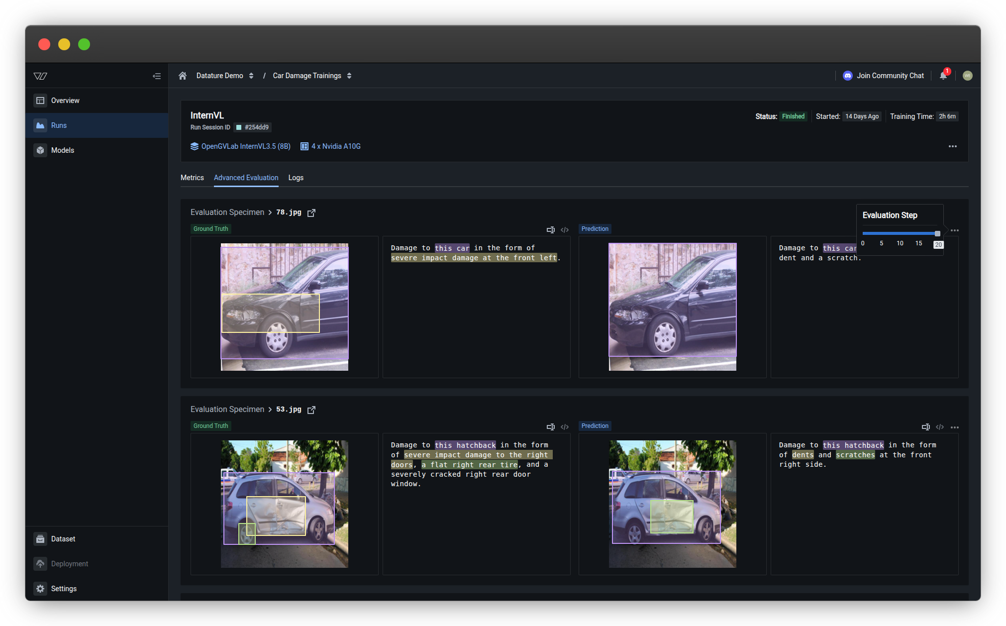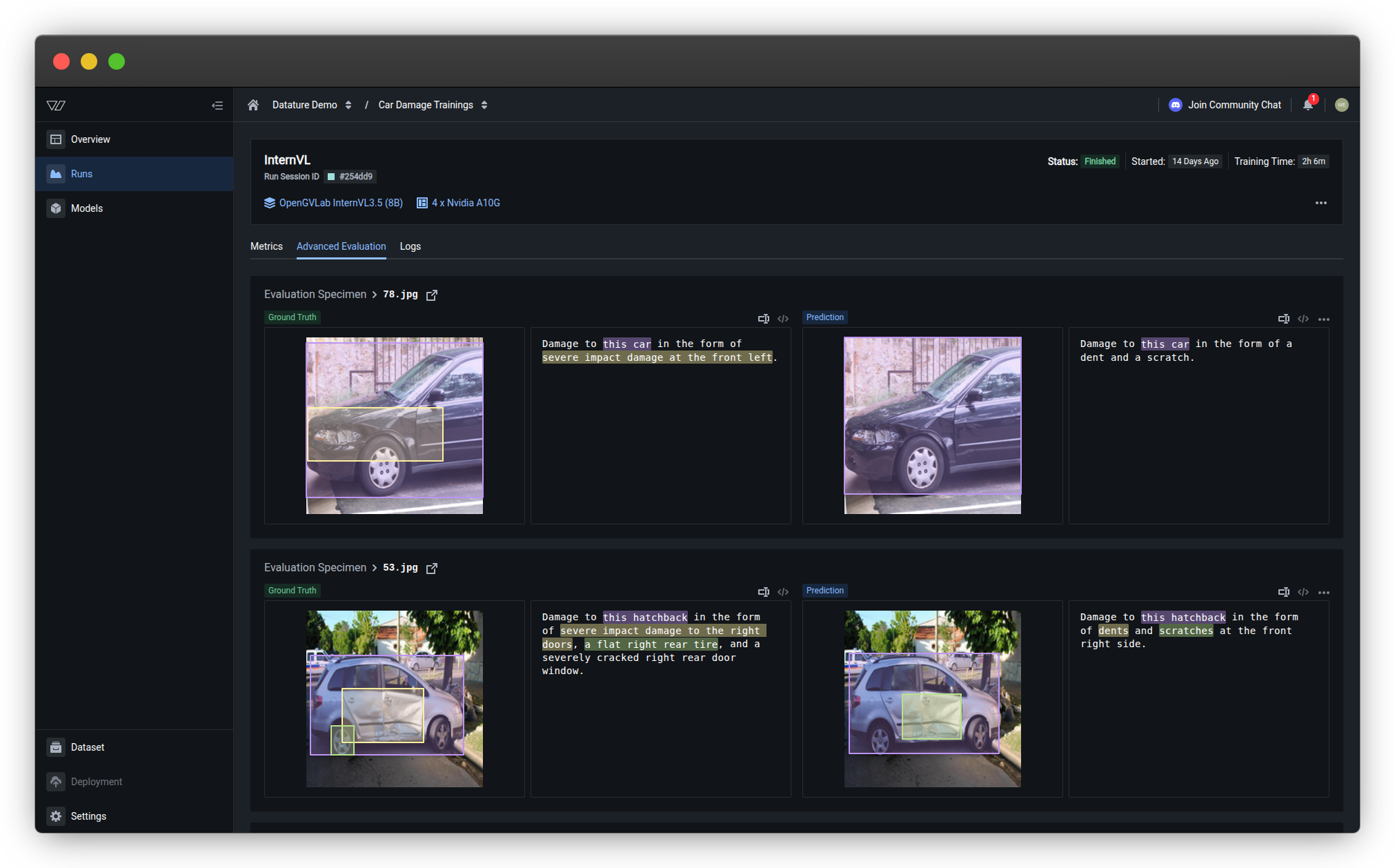 Access Advanced EvaluationOpen any completed training run and click the Advanced Evaluation tab to view side-by-side comparisons of predictions.