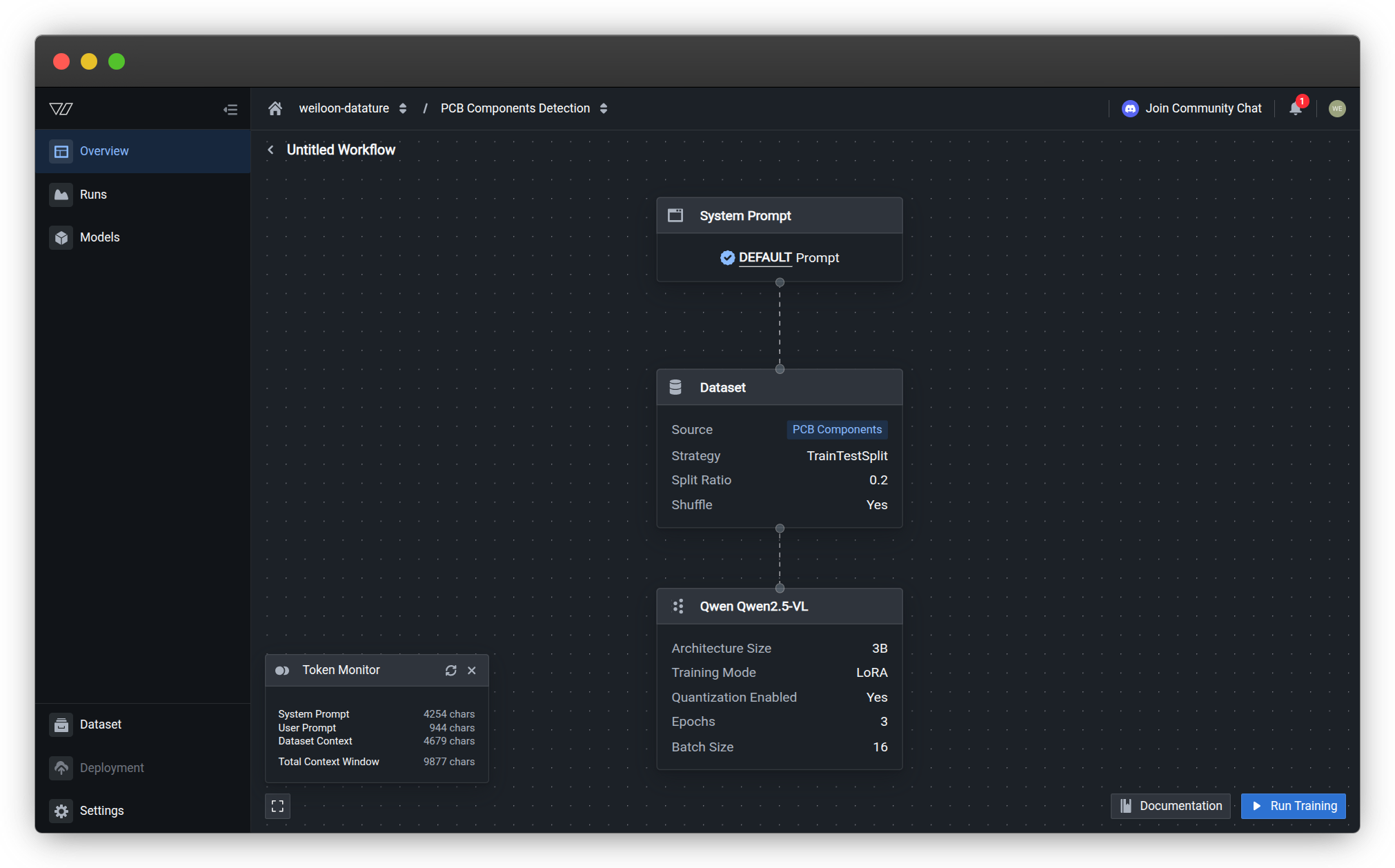From your workflow canvas, click Run Training at the bottom right to open the training configuration dialog.