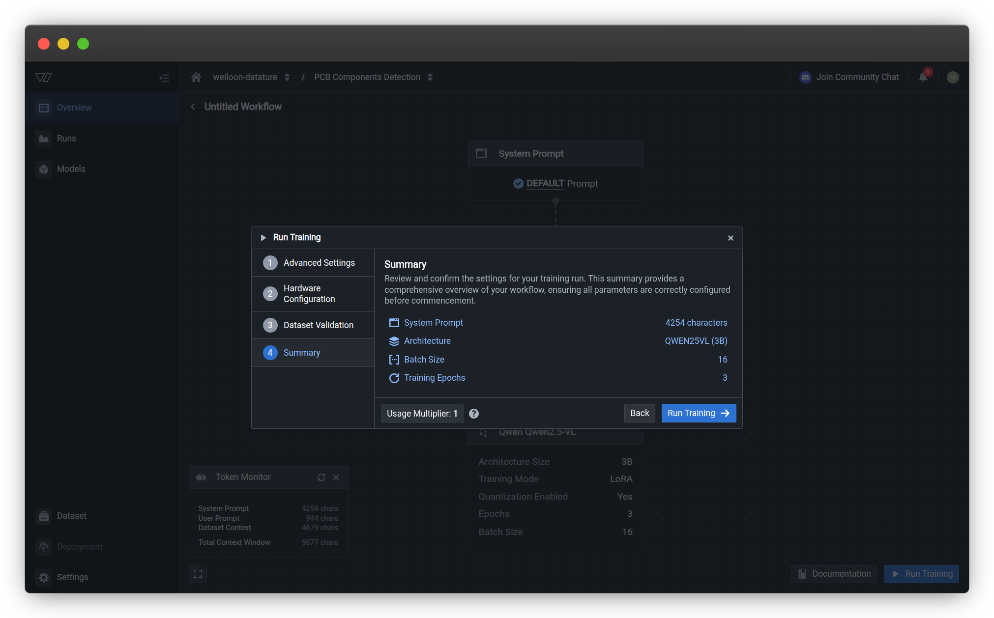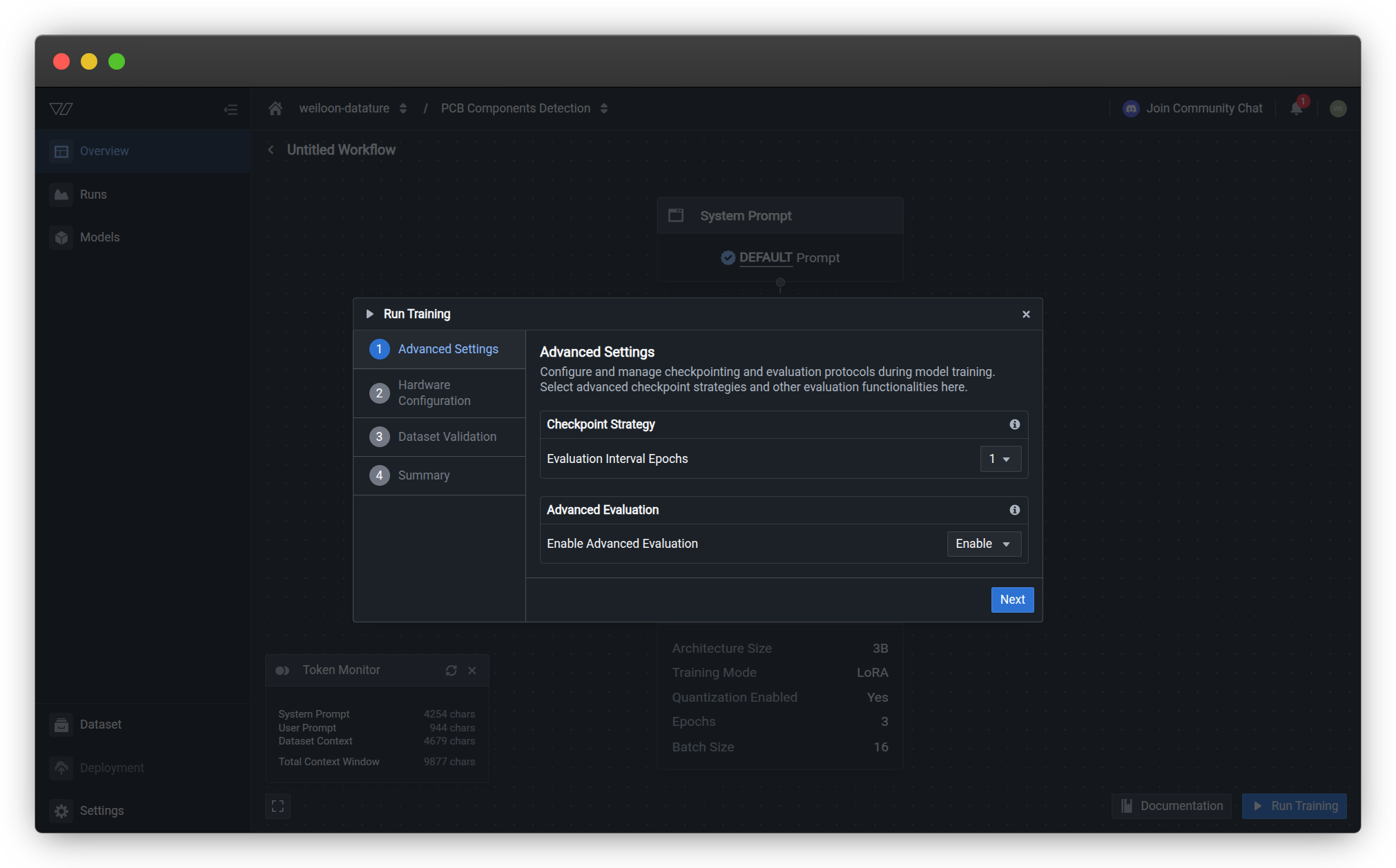 Configure your training run settings before launching model fine-tuning. The training configuration wizard guides you through four essential steps: advanced settings, hardware selection, dataset validation, and final review.