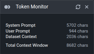 The token monitor reports usage in characters, not model-native tokens. Each model architecture ships with its own tokenizer, so the actual token count will vary depending on which model you select. Treat the character count as a relative sizing guide rather than an exact token budget.