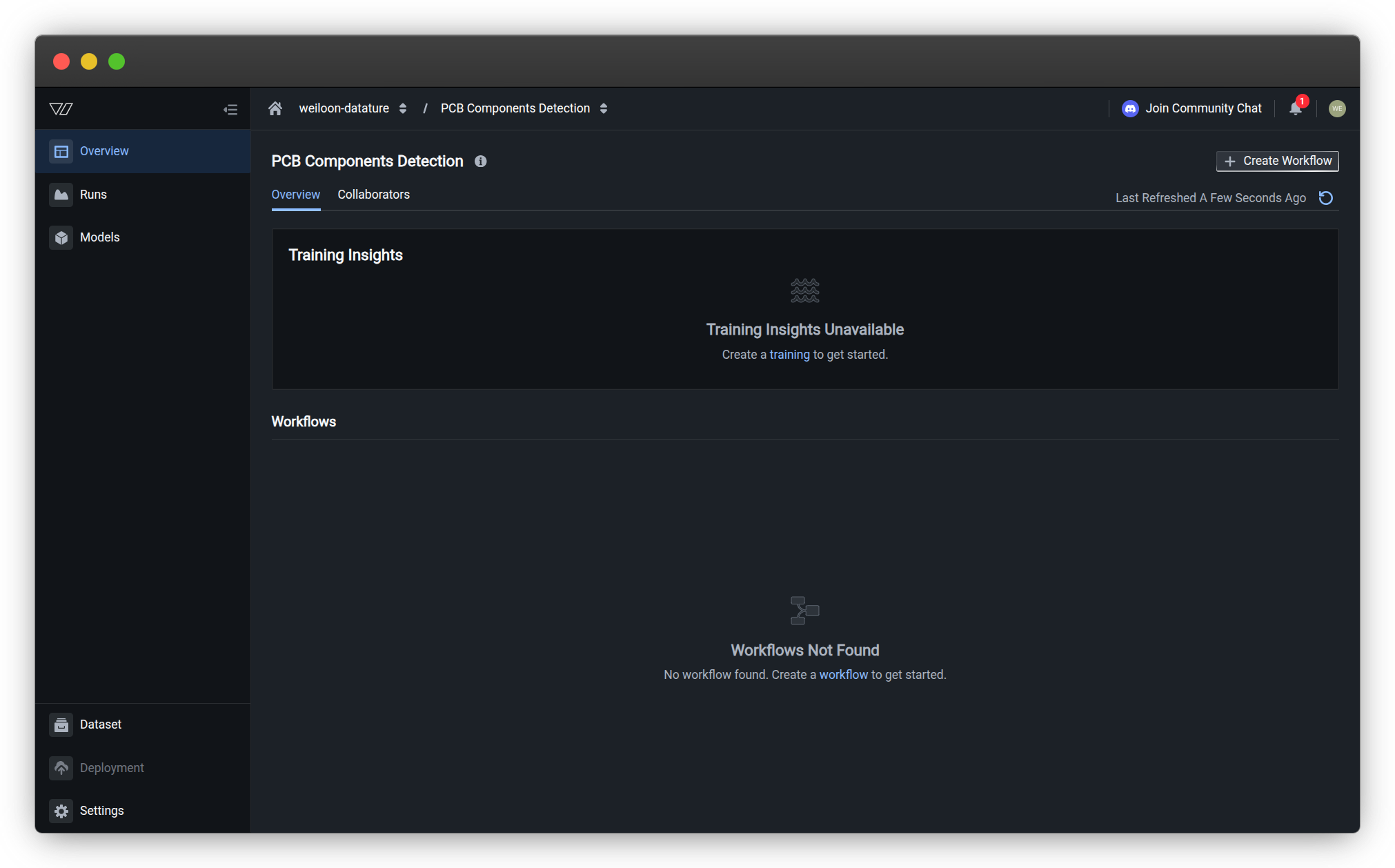 Workflows section — Houses your training workflow configurations. Workflows are reusable training configurations that define: