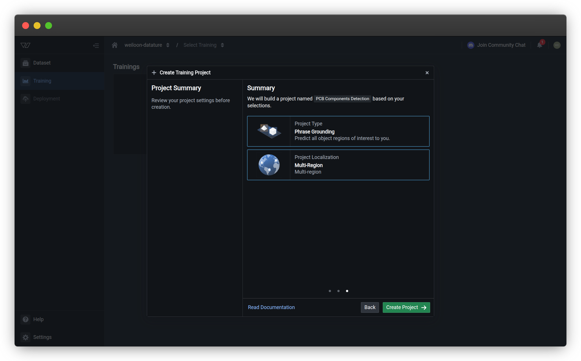 Training project created!Your project is ready. You can now create workflows, start training runs, and manage your models.