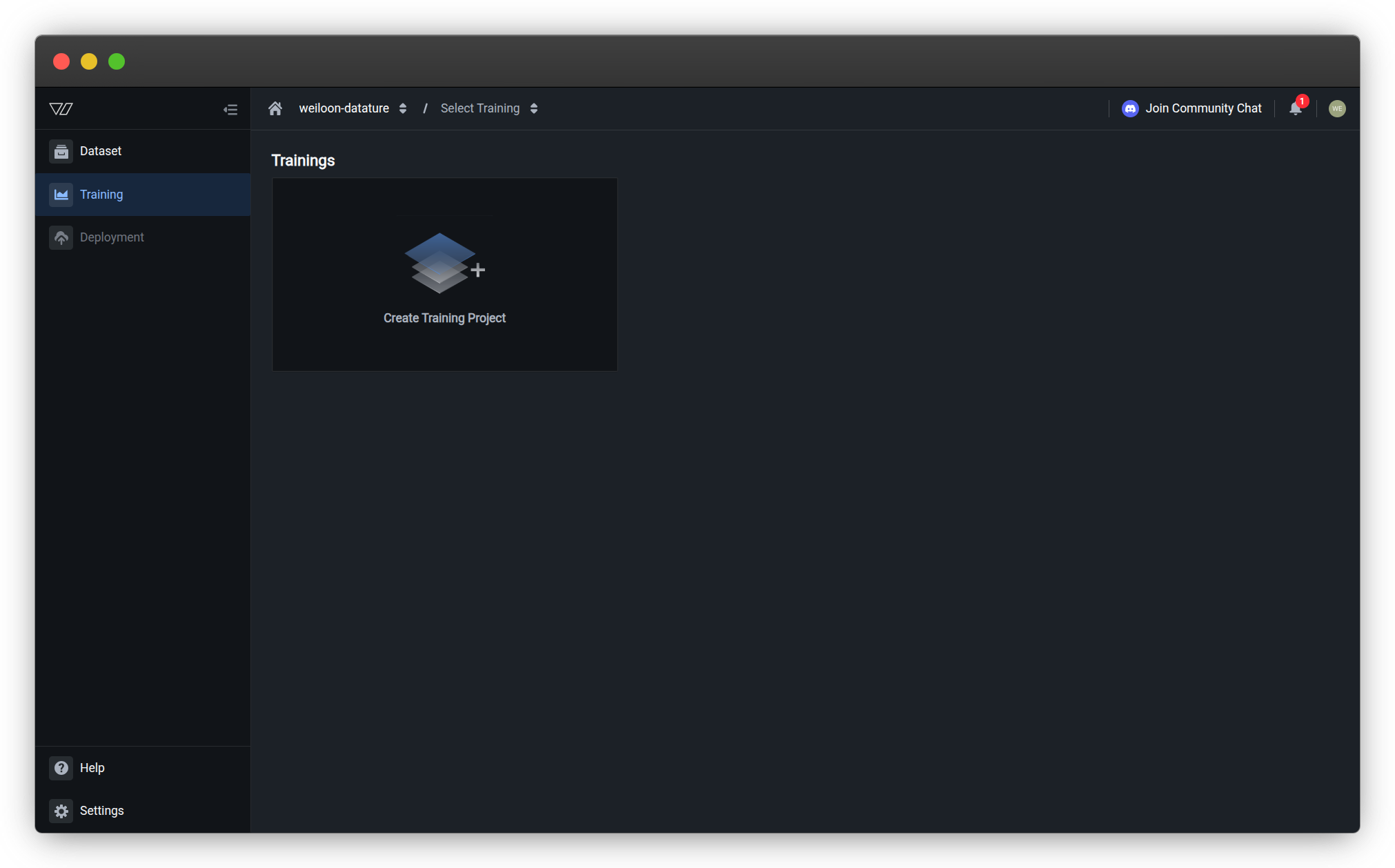 On the Training page, click the Create Training Project card to open the project configuration dialog.