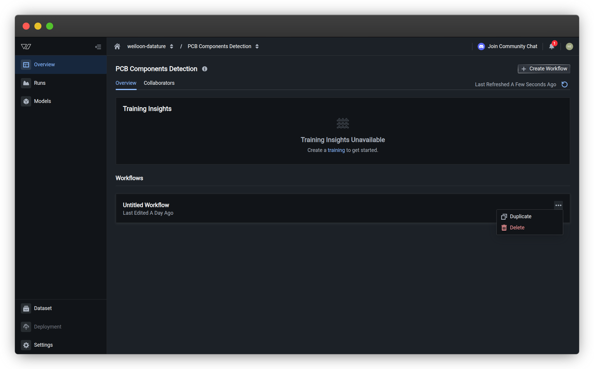 The duplicate is a fresh workflow with the same configuration but no training history.
