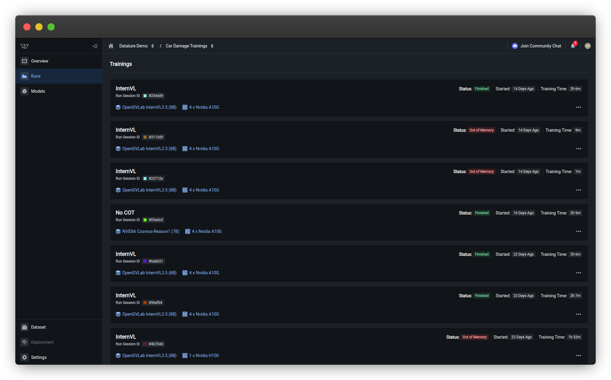 Track training progress and understand run states from Finished to Out of Memory, with troubleshooting steps