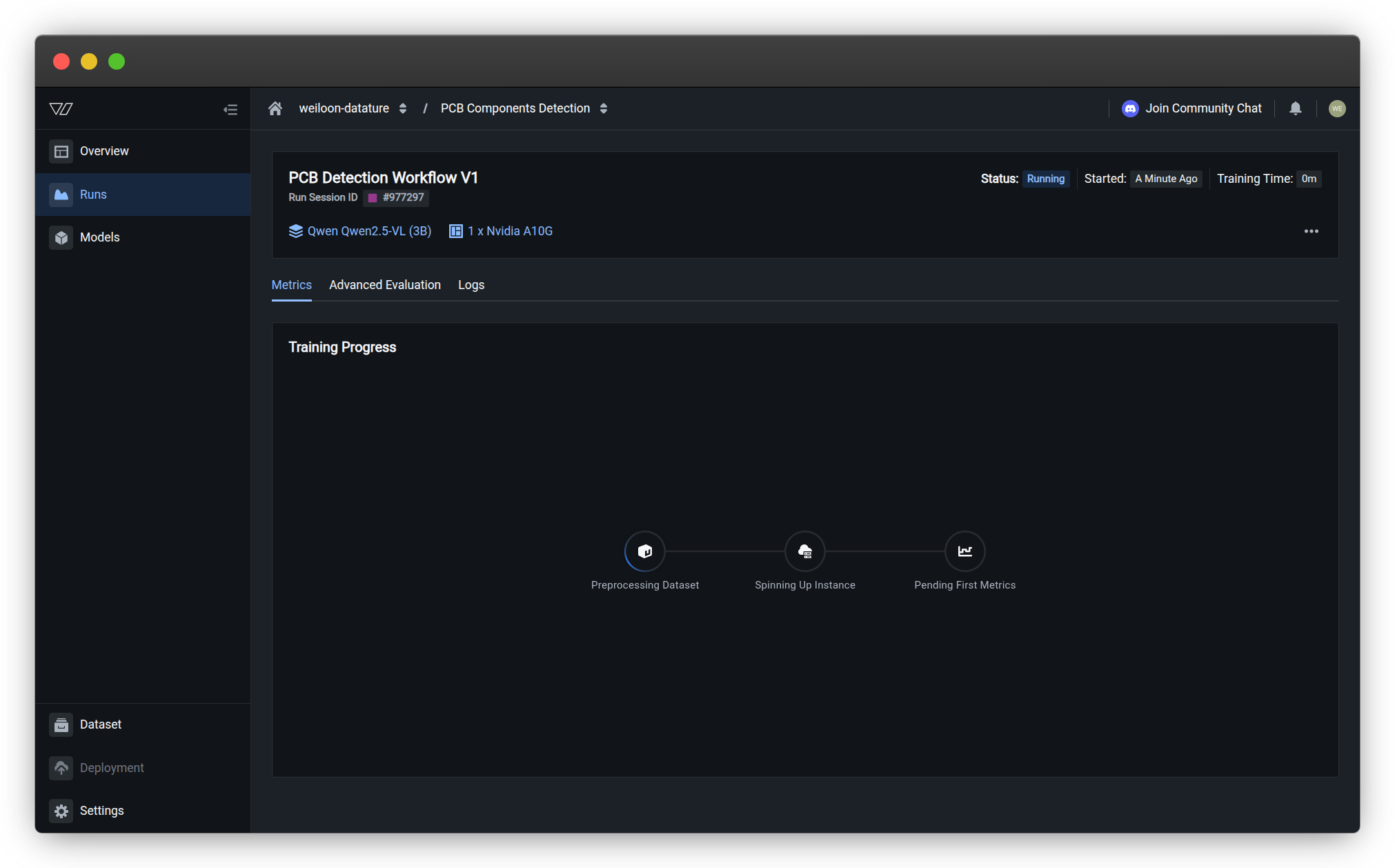 Monitor your active training runs in real-time to track progress, identify issues early, and ensure training proceeds as expected. Real-time monitoring helps you catch configuration errors before consuming excessive Compute Credits.