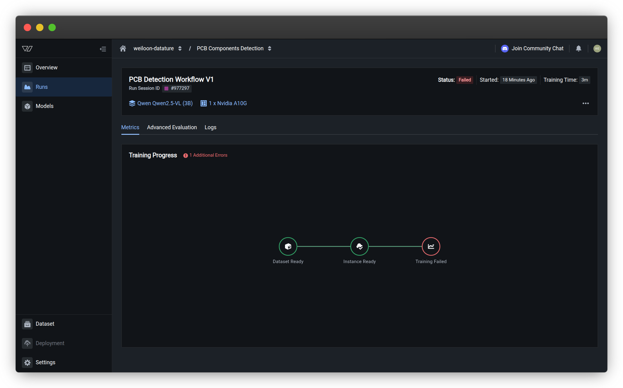 Track real-time training progress, watch for errors, and review metrics as your model trains.