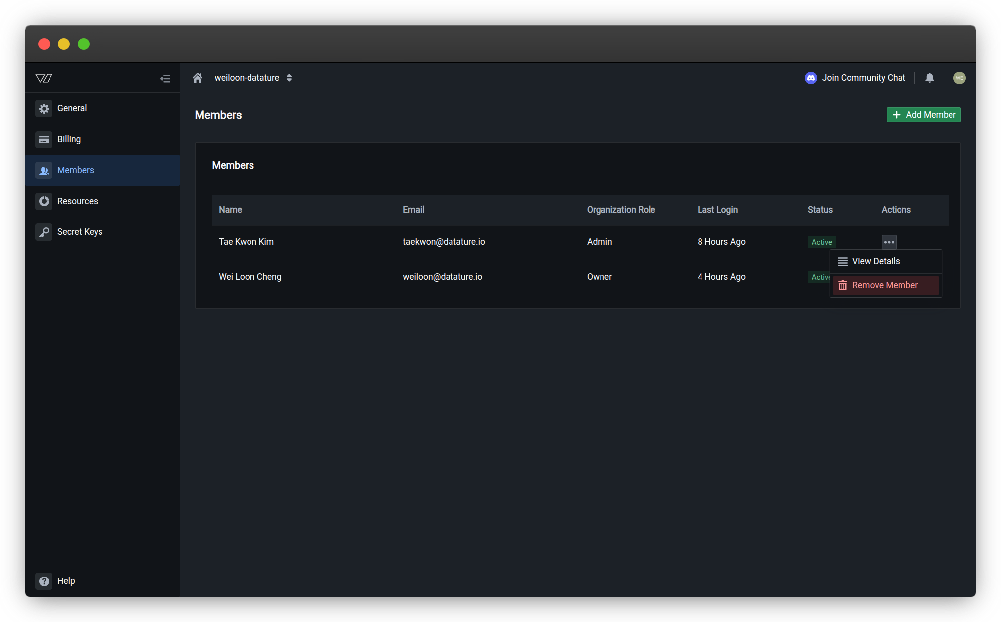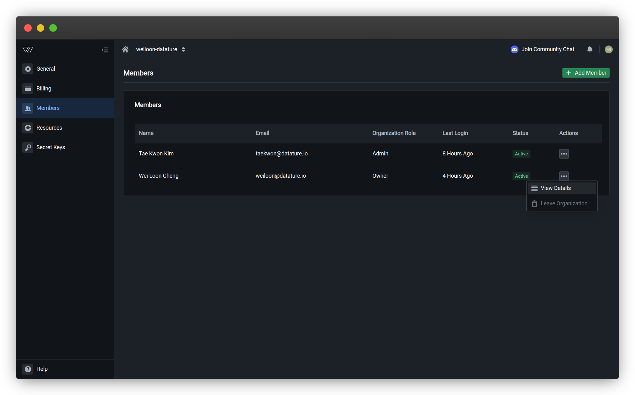 Ownership transfers must be handled by Datature support to ensure every organization always has an Owner for billing and account management.